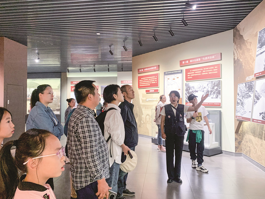 “國慶節(jié)的心情若有顏色,一定是紅色。瀘定作為一座紅色之城,擁有數(shù)不勝數(shù)的珍貴‘紅色寶藏’,這里有無數(shù)的紅色故事可以講述,也有光榮的革命精神在悠久傳承?!闭跒o定橋東橋頭排隊(duì)檢票的重慶游客李先生表示,他們一家?guī)е谏闲W(xué)六年級的兒子利用“雙節(jié)”假期,到瀘定體驗(yàn)“紅色文化研學(xué)”線路,從書本到現(xiàn)實(shí),走上瀘定橋接受紅色教育,感受長征精神。