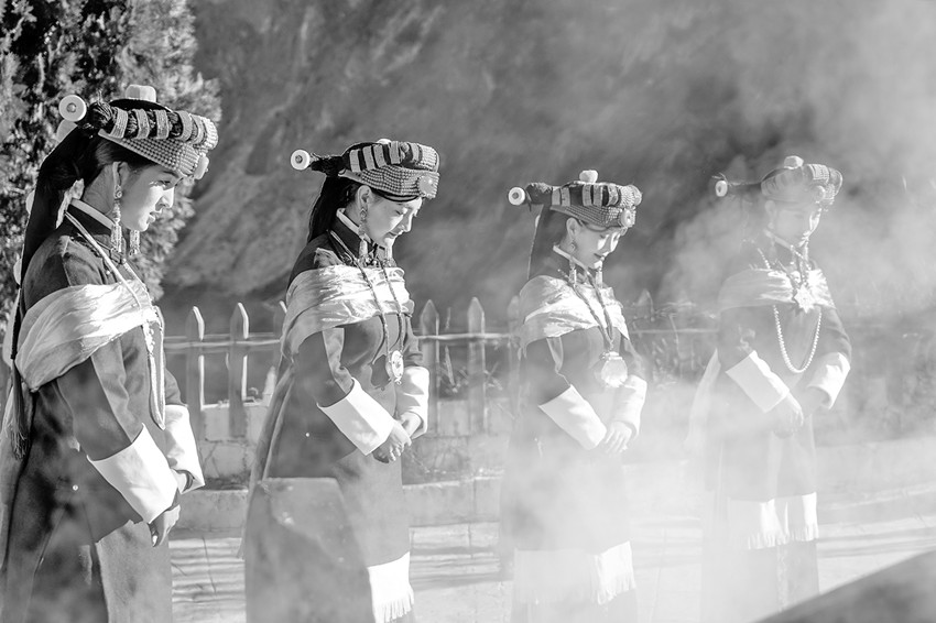 嘉賓體驗團首先來到位于甲居藏寨景區(qū)里的“點石·寶生居”特色民宿,只見一位年邁的嘉絨長者正主持“成人禮”儀式,桑煙裊裊,為即將成年的少女送去了誠摯祝福。完成儀式的嘉絨姑娘們隨長者一同跳起了非遺傳統(tǒng)舞蹈孔雀鍋莊,千年前東女古國的風采得以重現(xiàn)。