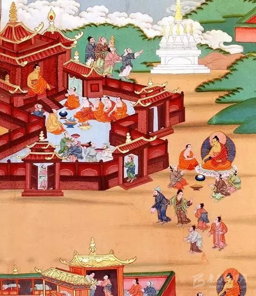 曬佛節(jié)時,寺院內(nèi)依墻懸掛一幅幅精美畫卷。這些畫用純天然顏料及金粉、銀粉繪制。畫中人物形象生動,山川、花卉烏獸和諧、線條流暢、章法嚴謹、色澤艷麗、栩栩如生。這套保存至今的《如意寶藤》唐卡畫,共三十一幅(現(xiàn)只有:9幅,另外兩幅文革期間失蹤), 至今猶如新著色的一般。其中, 由郎卡杰描繪的米拉日巴講經(jīng)圖,在只有幾平方毫米的空間中畫出了巖洞內(nèi)米拉日巴在講經(jīng),以及洞外獵犬和鹿聽經(jīng)等生動形象,其姿態(tài)美麗、線條清楚、色彩明亮,達到了傳神的藝術(shù)感染力,人們稱他是“巧奪天工之神”。據(jù)藏畫人員介紹,該畫在作色、筆畫等風(fēng)格方面是模仿漢地的技法,風(fēng)景、建筑物以及佛身上的裝飾品畫得非常逼真,這種畫法至今仍然在甘孜縣部分地方流行。
