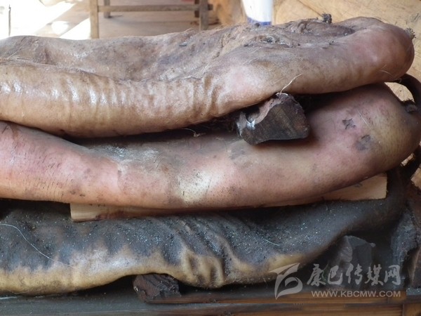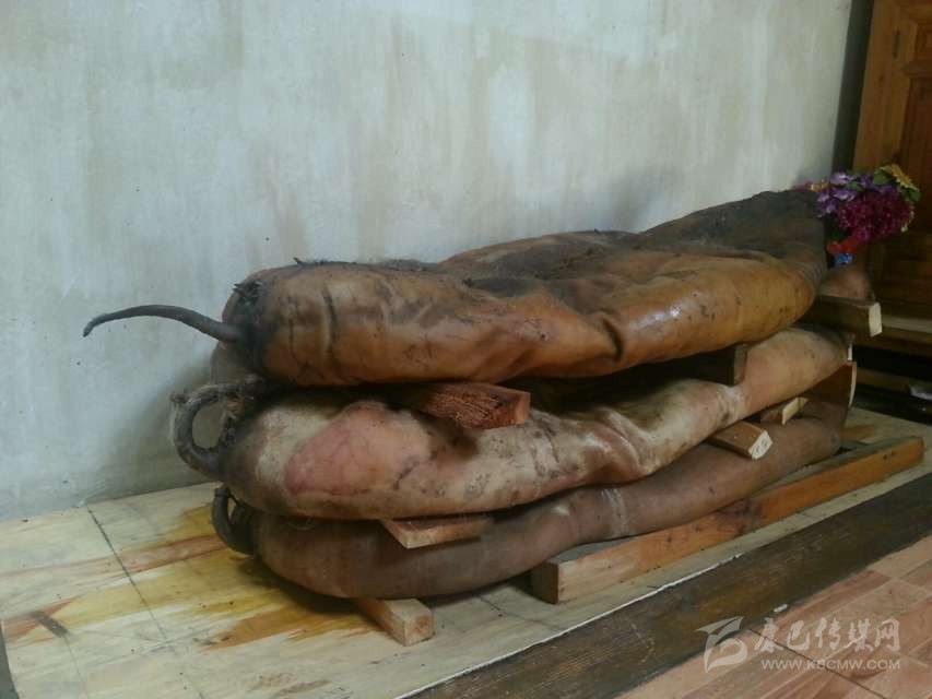 半干豬肉:在丹巴縣革什扎鄉(xiāng)有一種比較奇特的豬肉保存方法:將豬殺死后,不去毛,只在豬的腹部開一條口子取出內(nèi)臟,將血水清理干凈后用麻繩將腹部縫合。隨后用當(dāng)?shù)氐狞S泥漿敷在豬身上,在豬的身上形成一個(gè)厚約2厘米的殼,密不透風(fēng)。處理好后將其懸掛于灶塘之上,使黃泥在高溫的烘烤下快速硬化。如若發(fā)現(xiàn)黃泥層出現(xiàn)裂縫,立即用黃泥漿將其修復(fù)。等到第二年熱天時(shí),敲掉黃泥形成的硬殼,豬毛被輕松退去,豬肉依然比較新鮮。但這種保存新鮮豬肉的方法現(xiàn)在已經(jīng)很少見(jiàn)了,一是因?yàn)檫@種保存方法風(fēng)險(xiǎn)太大,稍有不慎豬肉就可能腐敗;二是如今物資供應(yīng)豐富,新鮮豬肉購(gòu)買方便,使得此種儲(chǔ)存方式失去了存在的價(jià)值。