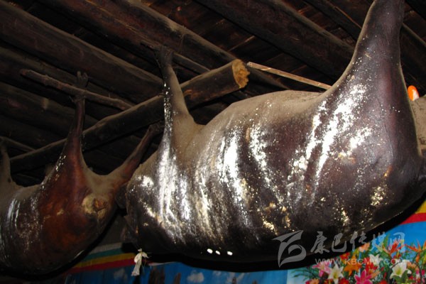 豬膘:在丹巴,豬膘是一種貯存豬肉的方式,是一種飲食習(xí)俗,同時(shí),它又是財(cái)富的象征。在丹巴隨便走進(jìn)一戶人家都可以看到少則幾扇、多則十余扇的豬膘掛在樓上,有些人家的豬膘甚至還貯存十多年之久。這些豬膘大多已經(jīng)被蟲吃掉了許多,但是他們也不會(huì)心痛,因?yàn)樵谶^(guò)去,看一個(gè)丹巴人家庭是否富裕,就看他家有多少豬膘,豬膘越多就越富有。