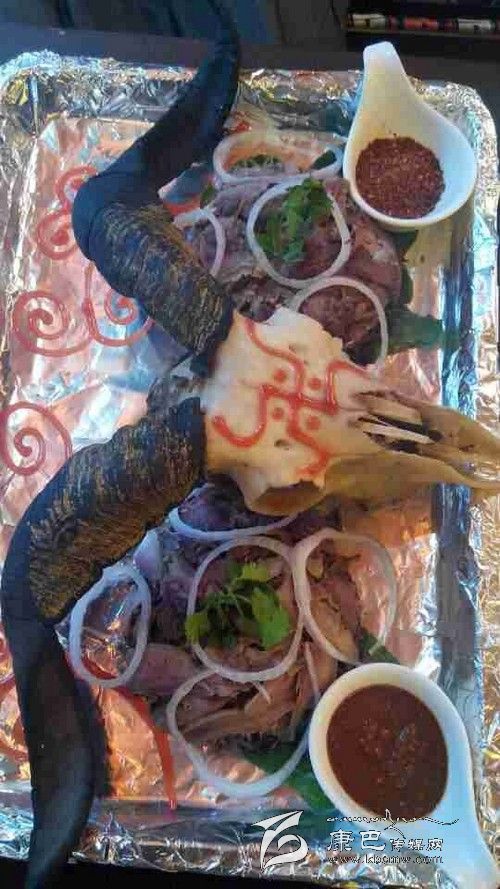 最值得一提的應(yīng)該是兩盤(pán)放在羊頭邊上的蘸料。一盤(pán)是四川的干辣椒面,里面放了鹽、味精、花椒,是大部分人都能接受的口味。而另一盤(pán)辣椒是西藏獨(dú)有的藏式辣椒醬,該辣椒的香辣和印度魔鬼椒有得一拼。藏式辣椒是使用涼水調(diào)和而成,只放一些鹽在里面,用羊頭肉沾上那么一點(diǎn)放在嘴里,立刻能感覺(jué)到辣味直襲你的味蕾神經(jīng)進(jìn)入你的大腦,形成一個(gè)字“辣”。如果你是不怕的,喜歡吃辣的食客,不妨試試這道“吉祥羊頭”帶給你的火爆。