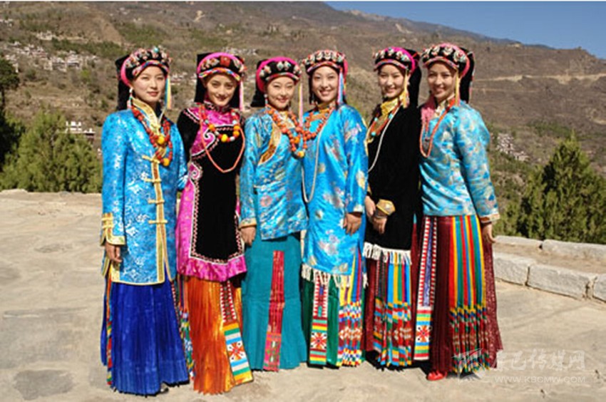 以丹巴縣和康定縣大渡河沿岸為代表??刀~通區(qū)和雅拉鄉(xiāng)一帶又自有特點(diǎn)。以長(zhǎng)方形黑金絲絨底繡花頭帕對(duì)折,戴于頭上,額前伸出約數(shù)厘米,腦后下披至后頸,寬至兩鬢,然后用大紅頭繩或五彩頭繩瓣發(fā)盤于帕上,辮子套各式辮飾。外披披風(fēng),一般是條紋白色或原初皮毛披風(fēng),內(nèi)穿錦緞上衣,下著五彩百褶長(zhǎng)裙,腰系絲織或綢質(zhì)彩色花腰帶,男戴金絲帽,足穿彩靴為風(fēng)彩。嘉絨地區(qū)服飾還受羌族習(xí)俗的影響,生活俗裝普遍穿長(zhǎng)等衫,以藍(lán)黑色為主,下身系圍腰,腰扎寬大彩帶,冬天穿羊皮褂或羊毛織成的無領(lǐng)服等。