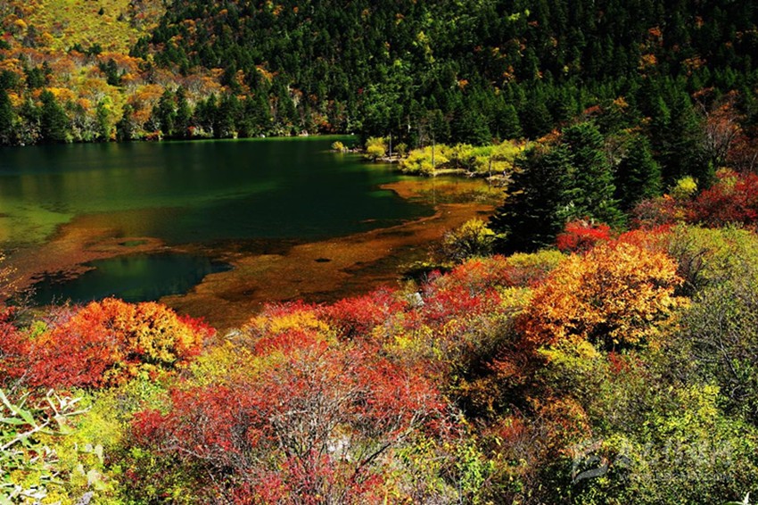 月牙形的七色海猶如一面五光十色的鏡片,鑲嵌在森林與草坪之間。叢林中百鳥輕歌曼舞,湖岸坪清幽秀雅,湖中水草飄逸,羌活魚在水底卵石中悠游,蕩舟穿霧興波,湖光山色眼底。環(huán)湖覽勝,“蓮花霧繞”、“蓮花夕照”、“駝峰倒影”等佳景襯托出七色海自然的靈趣,更兼那四時陽光雨霧變化莫測,湖水呈現(xiàn)赤、橙、黃、綠、青、藍、紫多種色彩的奇觀,堪稱湖景一絕。