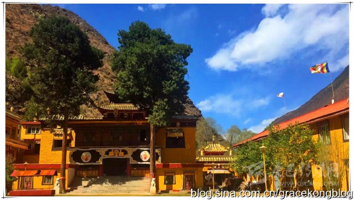 該寺廟為四合院布局,坐北朝南,原占地面積2700㎡,為藏漢結(jié)合建筑,由大殿、藏經(jīng)樓、僧舍組成。大殿為藏式石木結(jié)構(gòu),有二十四根雕龍木柱,殿分二層,供有釋迦牟尼、宗喀巴、未來(lái)佛、千手觀音、南海觀音等神像,殿側(cè)藏經(jīng)樓藏經(jīng)書(shū)上千卷。殿堂富麗堂皇,壁畫(huà)五彩斑斕,閣樓古樸美觀,雕梁畫(huà)棟,分外精巧;廟四周古柏參天蔽日,綠草如茵,風(fēng)景格外迷人。